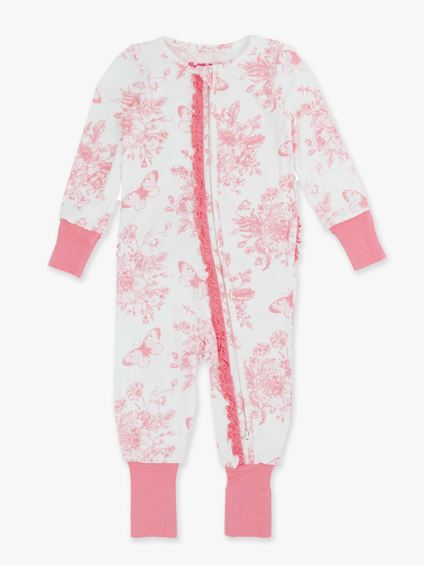 Baby Girls Bamboo Viscose Pink Butterfly Garden Toile Convertible Ruffle One Piece Footie Pajama