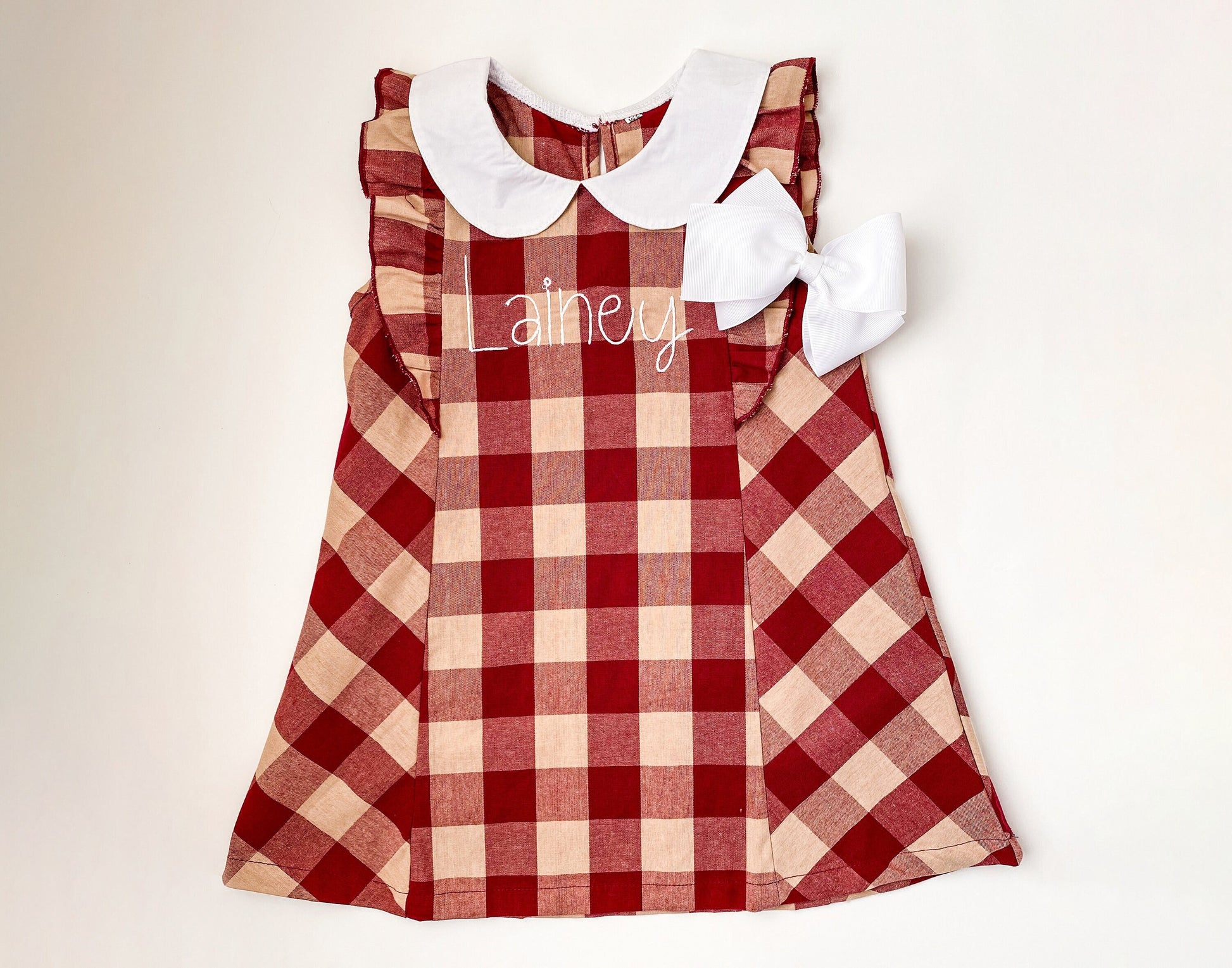 Look no further than our girl's monogrammed plaid peter pan collar back to school dress!