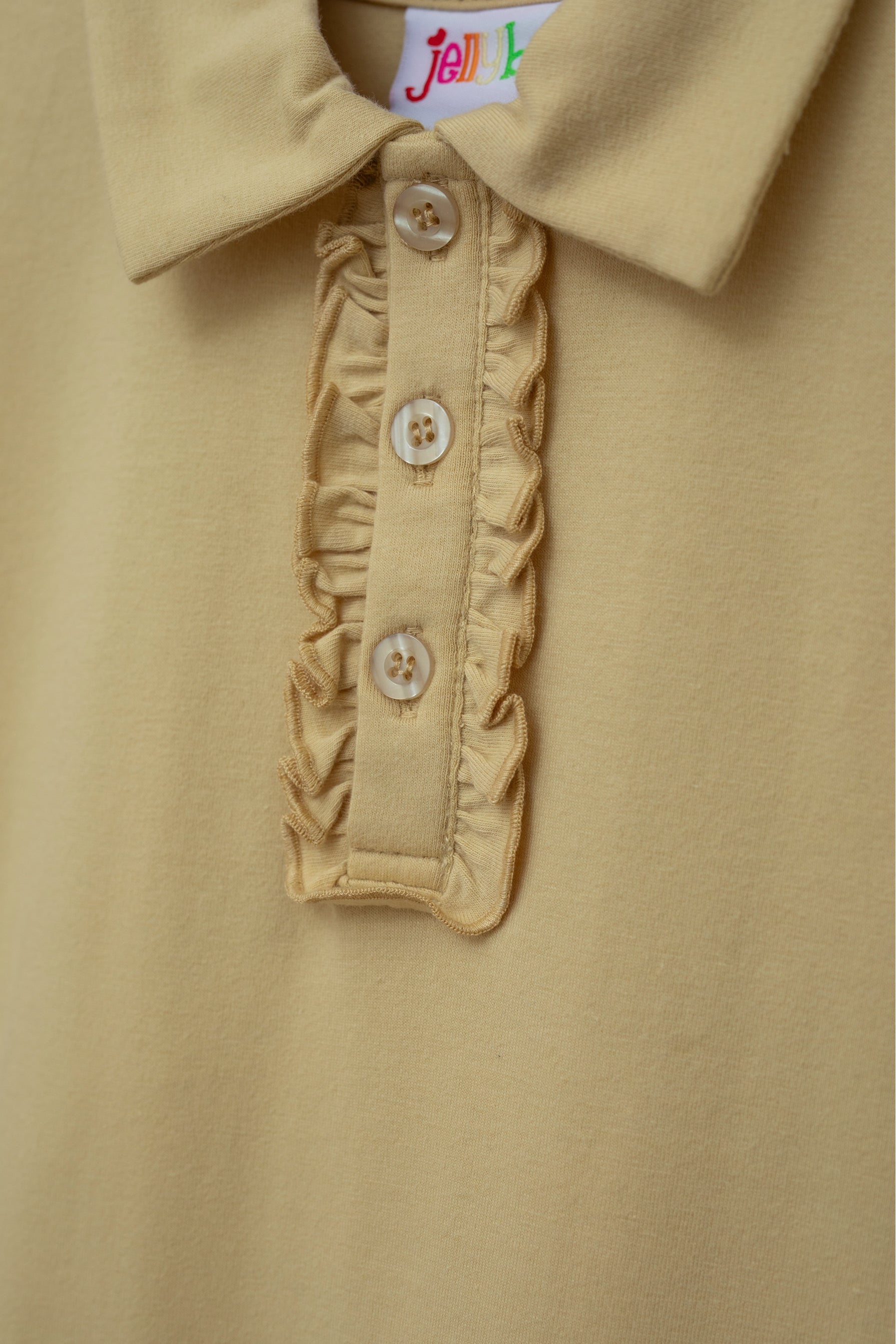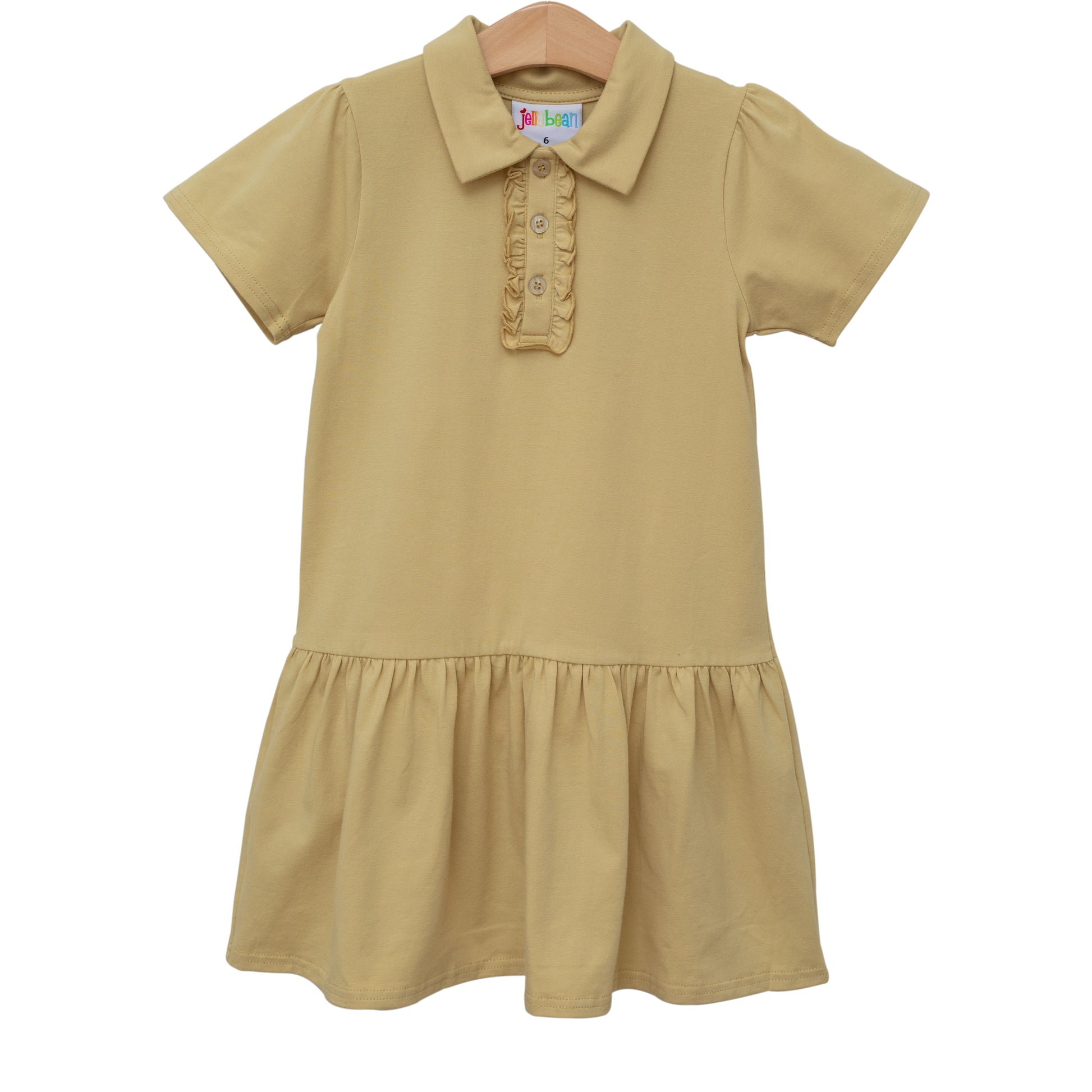 The girl's ruffle polo dress in khaki is the perfect blend of comfort and style for your little one. Featuring a charming drop waist design, this dress is adorned with delightful ruffles and buttons that add a playful touch.