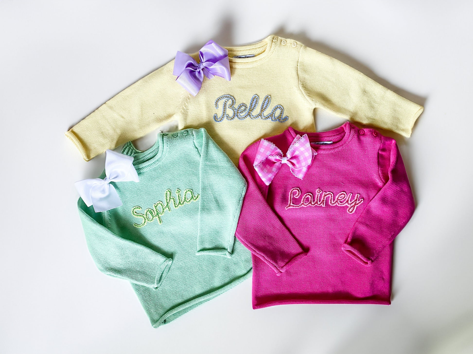 Monogrammed Felted Name 100% Cotton Rollneck Sweater, Matching Bow for Toddlers and Kids, High Quality Customized Winter, Gift, Christmas