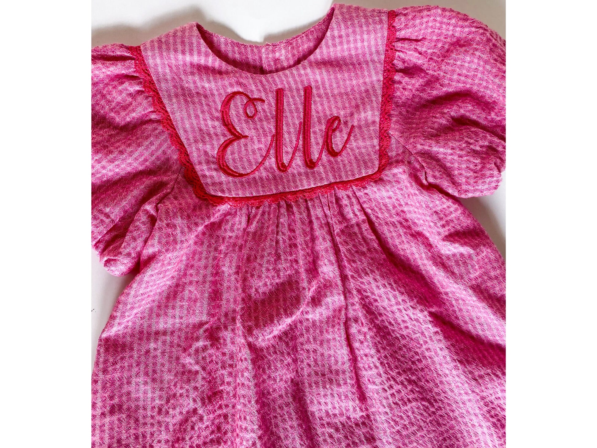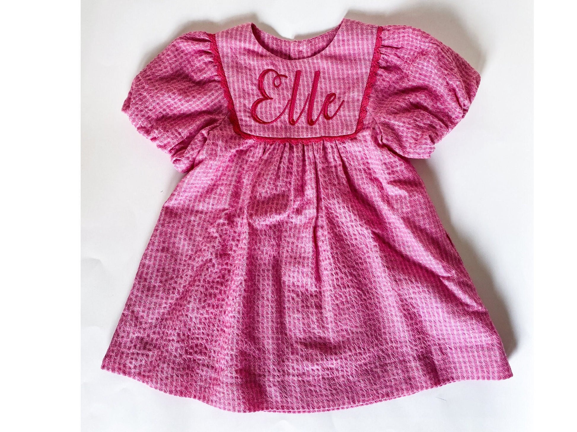 Toddler Easter Dress, Pink Monogrammed Lace Trim Textured Dress, Special Occassion, Embroidered
